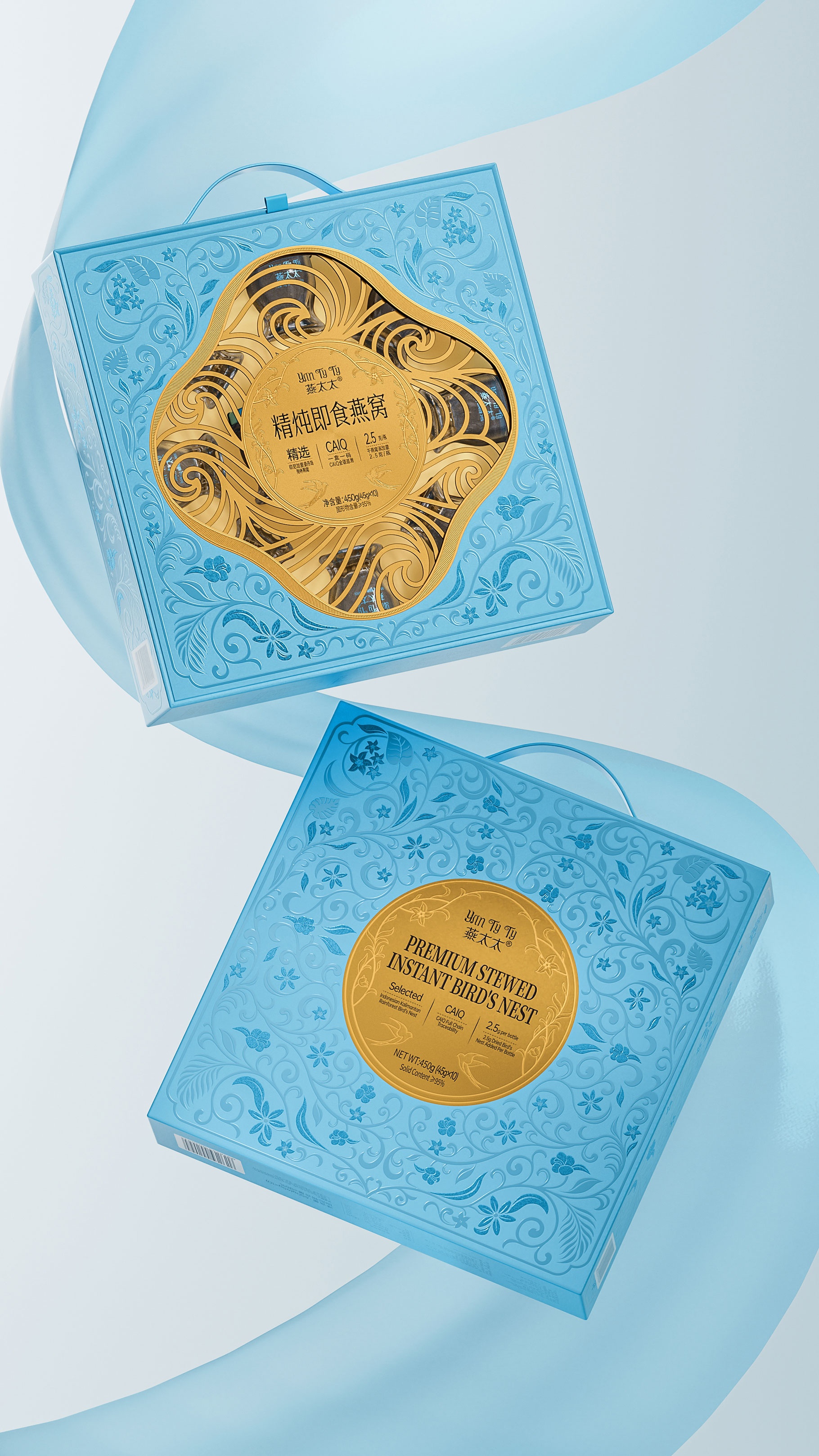 整體包裝創(chuàng)意以獨創(chuàng)三層視覺敘事:中部采用東方園林“框景”手法打造鏤空視窗,湖藍色藤蔓紋樣層疊延展,再現(xiàn)雨林生態(tài)的呼吸韻律,虛實交錯間透現(xiàn)燕窩瑩潤質(zhì)感。